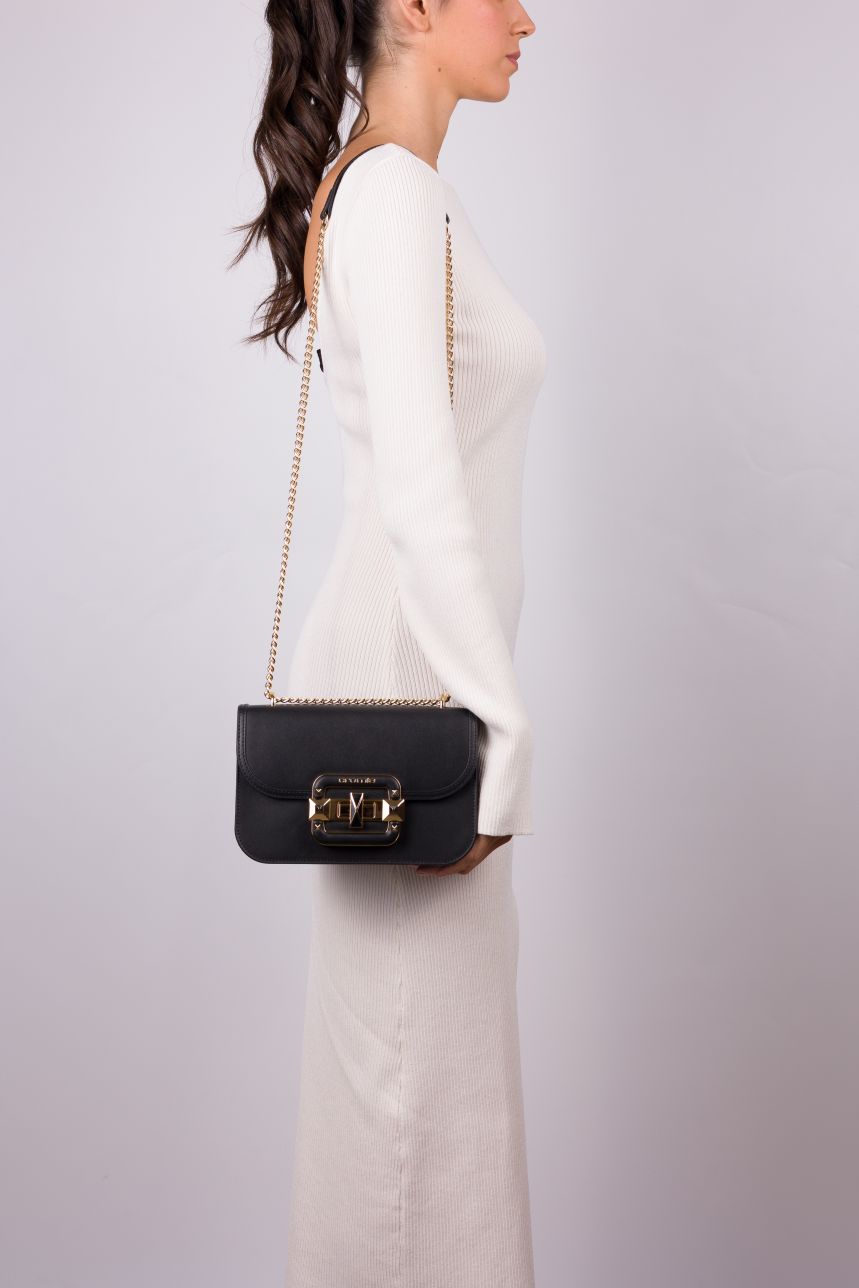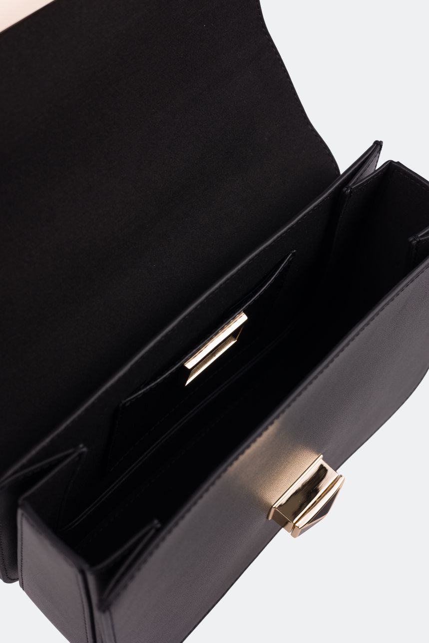 Crescent-shaped flap bag made of saffiano-printed calfskin, wearable as a handbag or a shoulder bag, enriched with a metal plate with Cromia logo. This innovative bag shows a rounded silhouette and a minimal design.