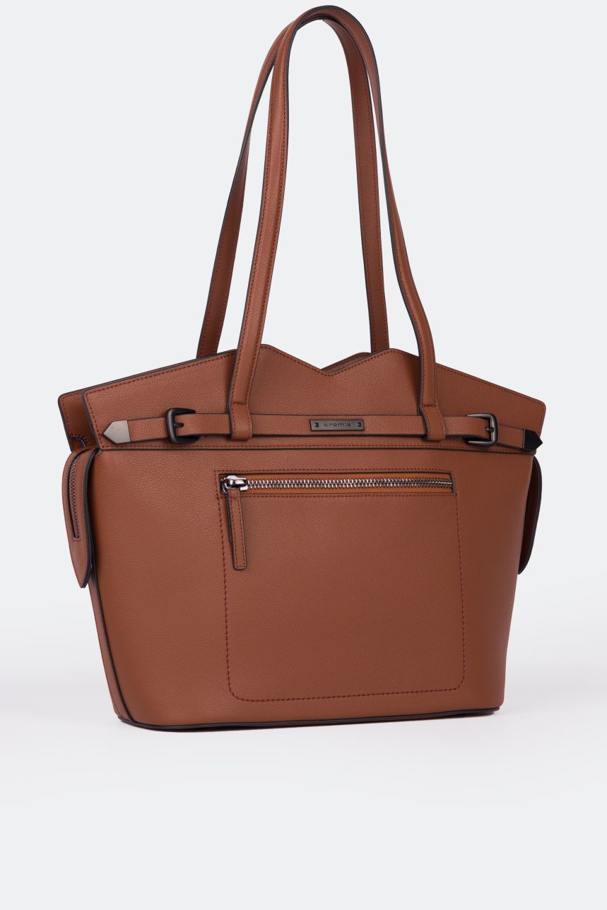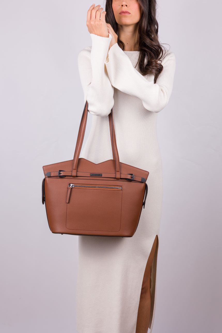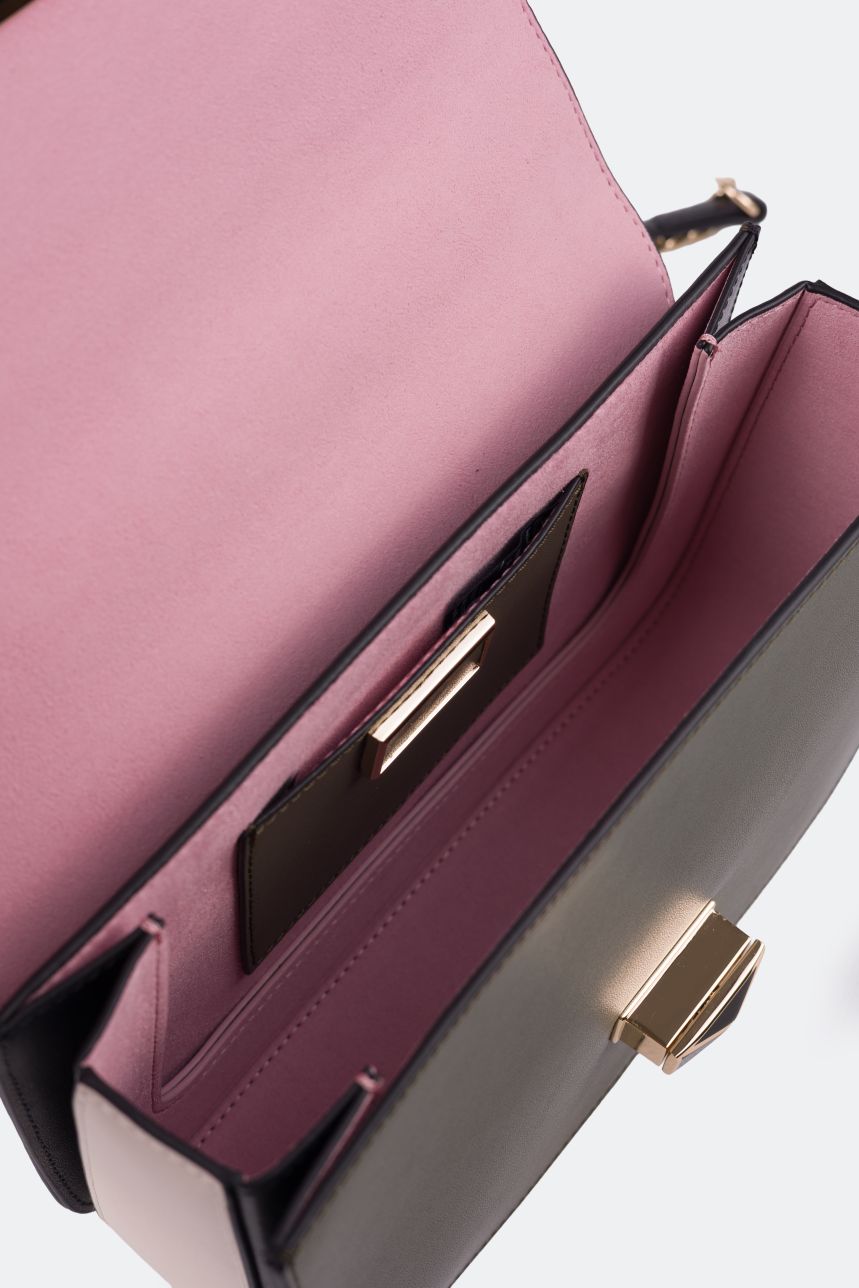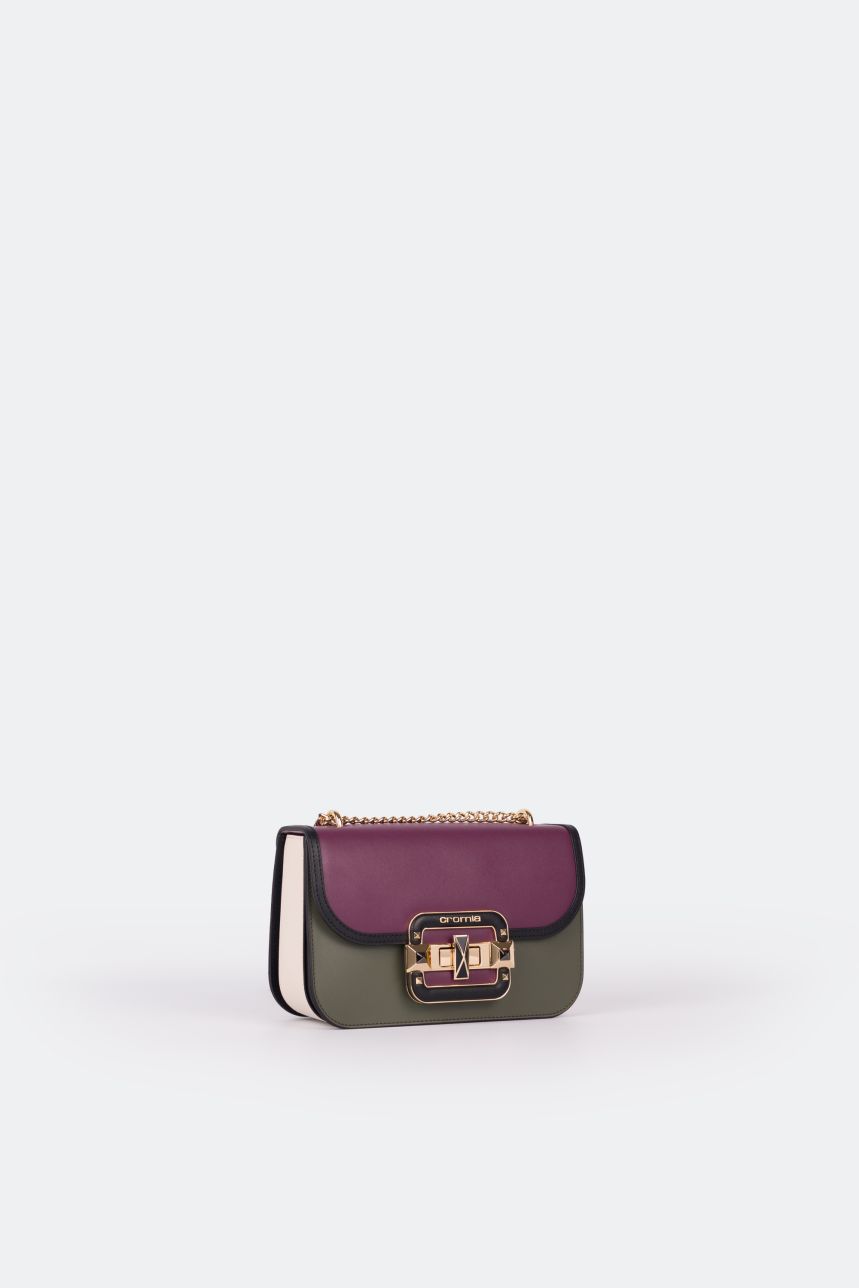 Flap bag made of smooth calfskin, leather and metal rings on the handle, adjustable leather strap, and enameled metal closure with Cromia logo. Light gold accessories.