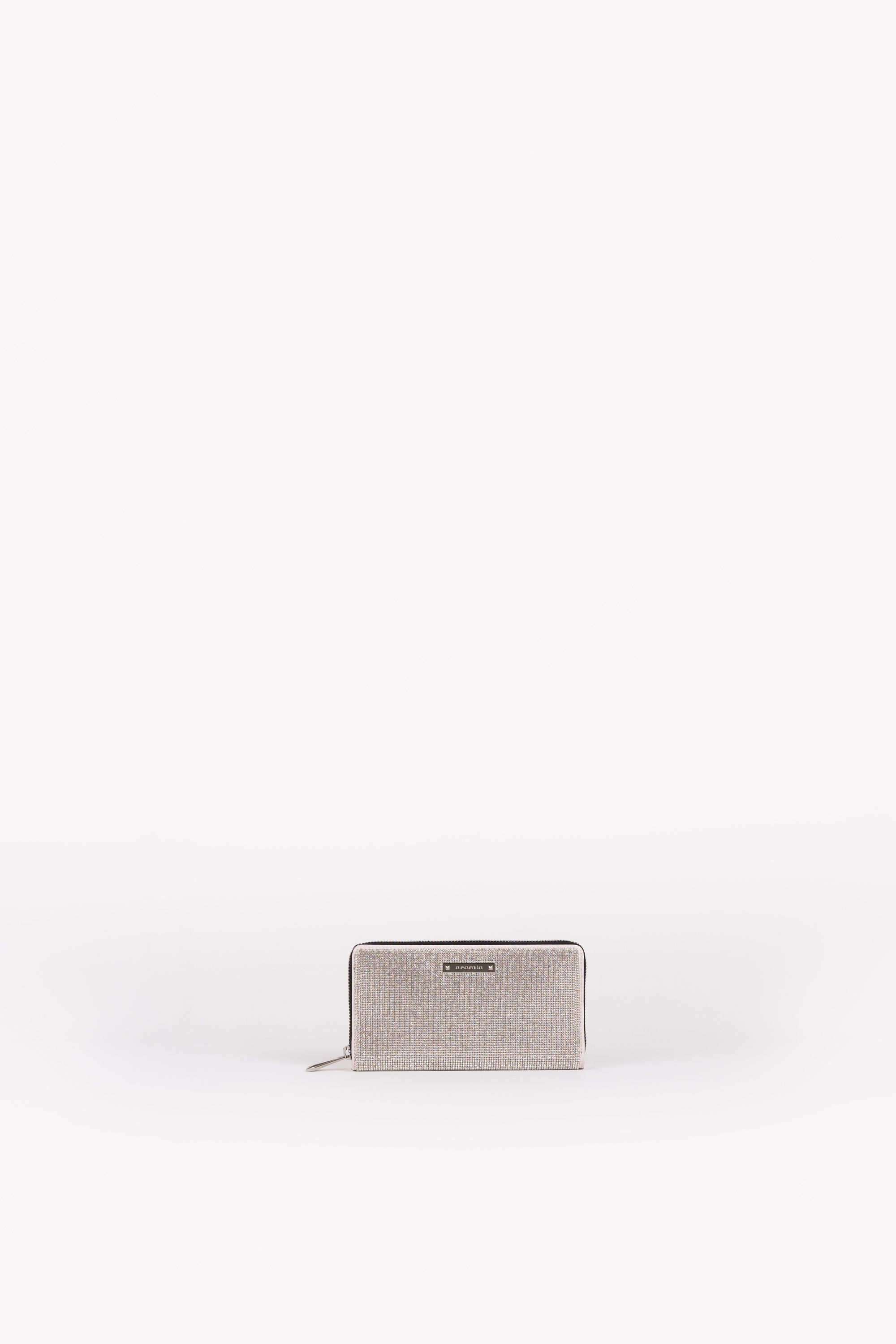 Portafoglio in vitello con applicazione mesh di strass e serigrafato è chiuso con zip su tre lati. L’interno è organizzato in 8 scomparti a soffietto di cui uno dotato di zip, 8 fessure per carte di credito e 2 tasche laterali piatte. Accessori metallici colore nikel