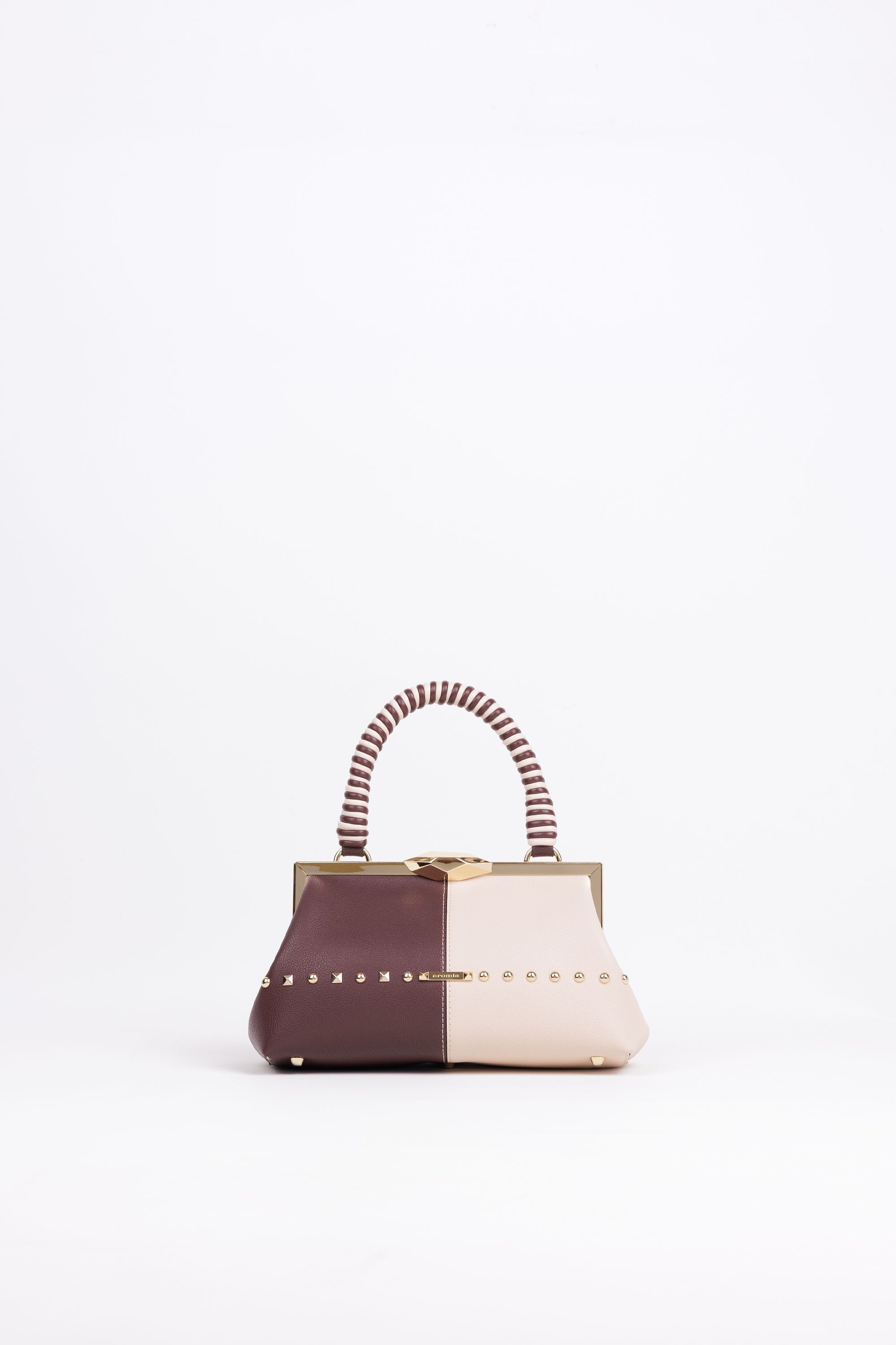 BORSA A MANO PICCOLA IN PELLE CON STAMPA MICROGRANA E CERNIERA DI METALLO CON SALTARELLO DAL DESIGN SFACCETTATO E MOTIVO DI BORCHIE. LA BORSA È ARRICCHITA DAL MANICO TUBOLARE CON UN INTRECCIO MODERNO. GLI ACCESSORI SONO ORO CHIARO.