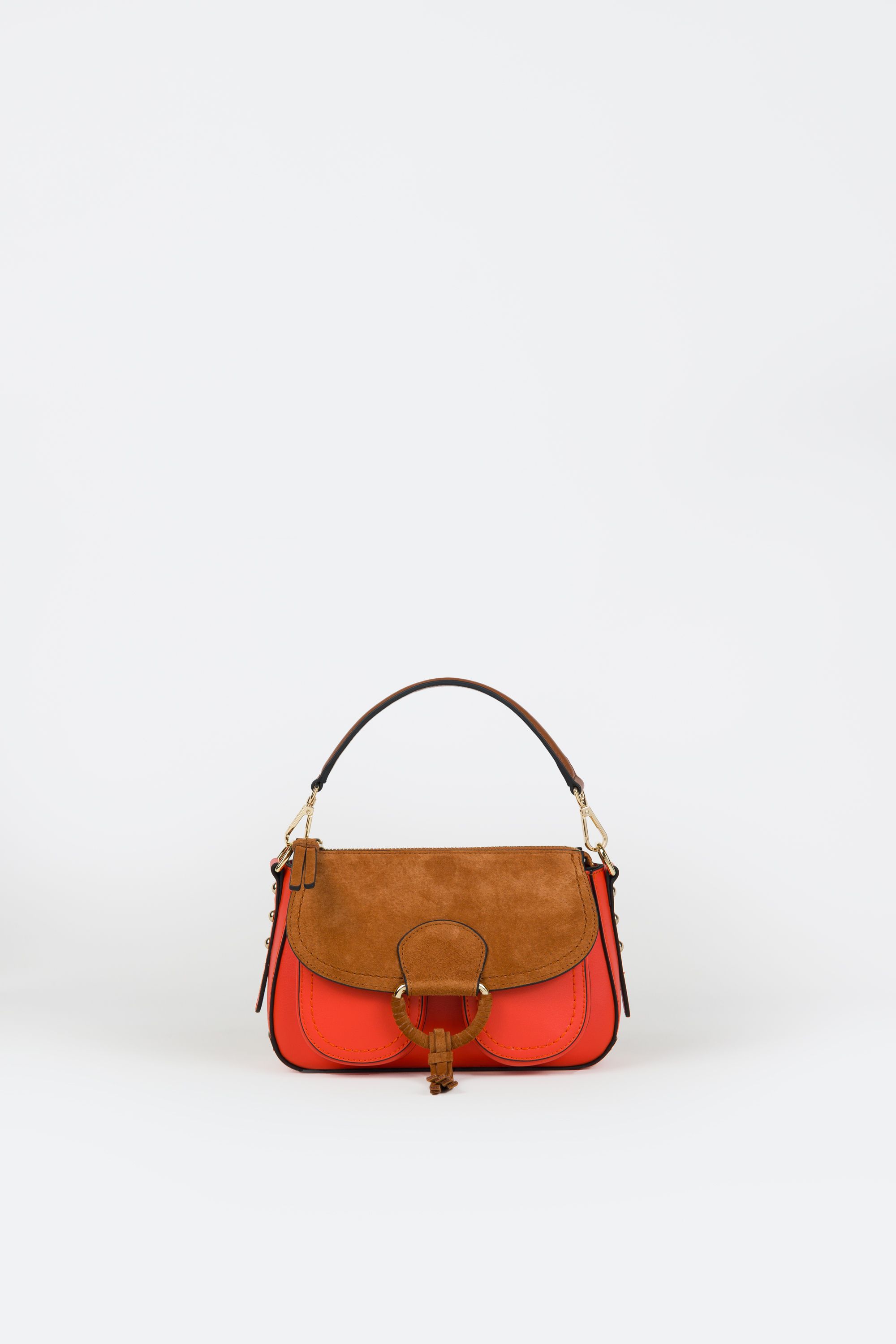 Minibag con lampo con due mini tasche sul davanti , realizzata in pelle liscia e pelle effetto camoscio, dotata di tracolla per l’indosso a crossover, accessori oro chiaro.